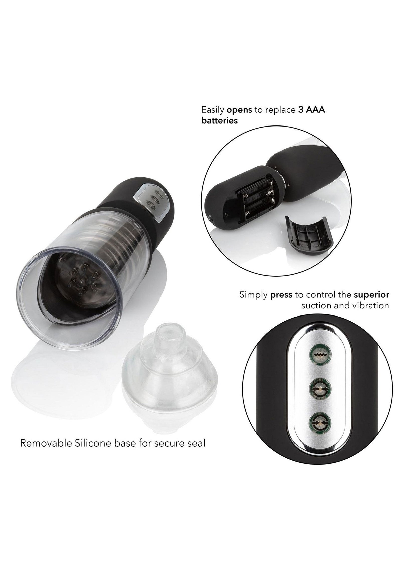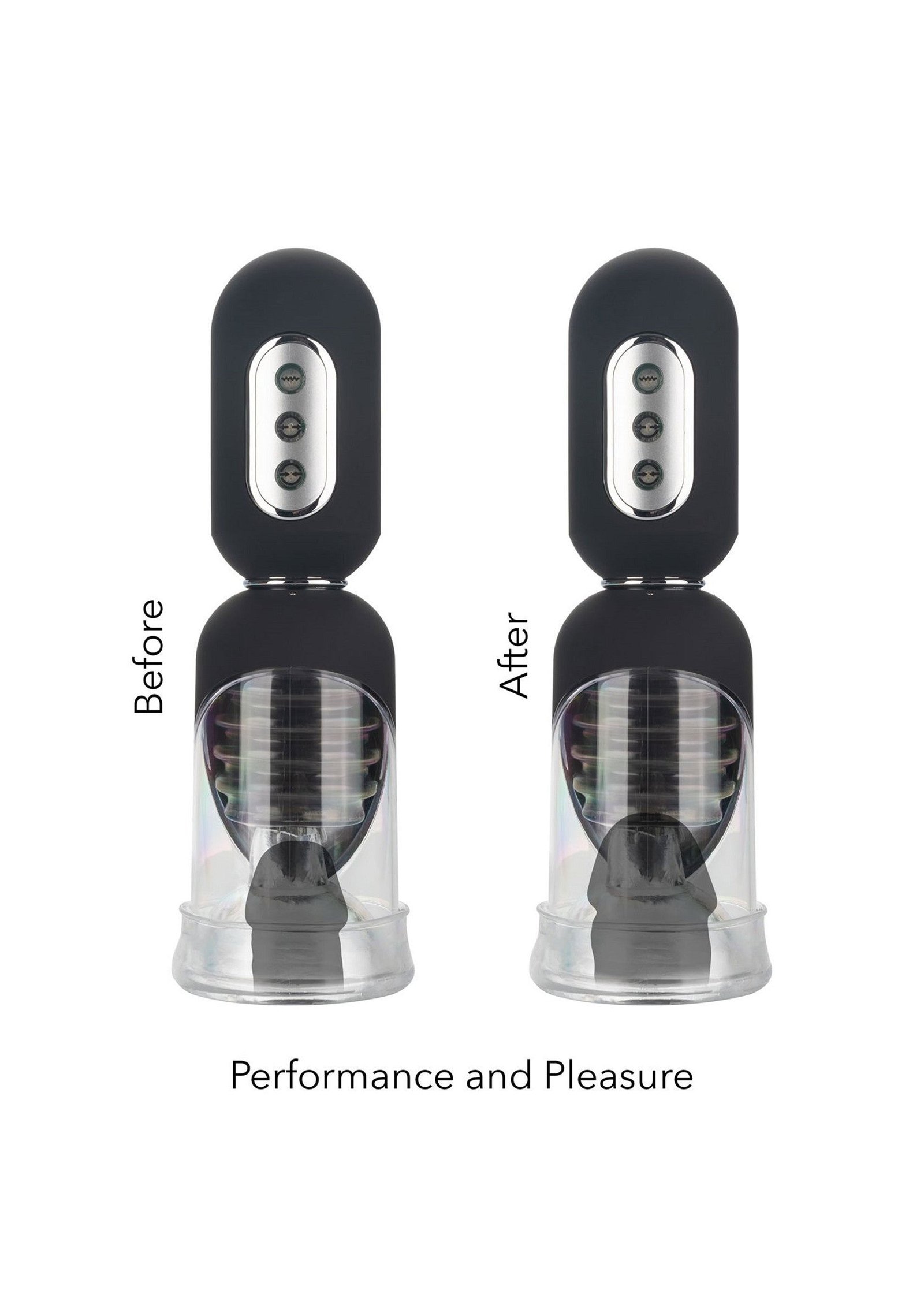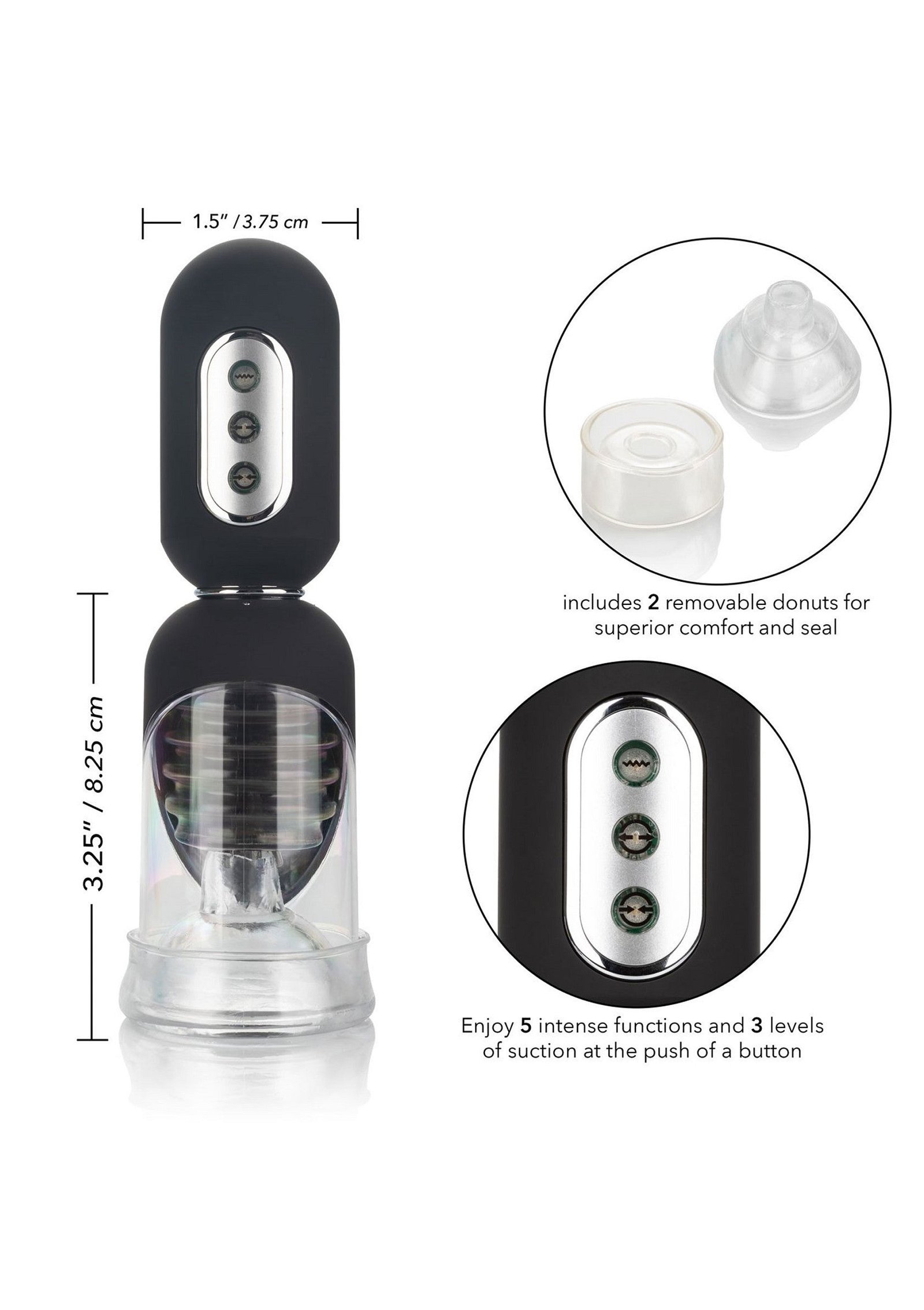 Supersize your pleasure piece with the Optimum Series Get Hard Head Pump Set. This high-tech, completely automatic pump delivers 3 levels of intense suction, 5 vibration functions & a vibration tickler cushion for truly explosive results. Increase stamina or give yourself over to total pleasure with 3 levels of sucking stimulation and 5 independent functions of vibrations. A soft vibrating contact pad with ticklers gives you the full-coverage sensation you have been cravingDive deep into intense suction while the soft, vibrating internal landing pad uses the teasing ticklers to thrill your pleasure tool with full coverage stimulation. Enjoy powerful suction and a superior seal with two unique interchangeable donuts. Use the simple donut for your regular pumping session and the other ultra-tight donut for knee-shaking stimulation. This removable open-ended chamber sleeve is easy-to-use, easy-to-clean and requires no special care.