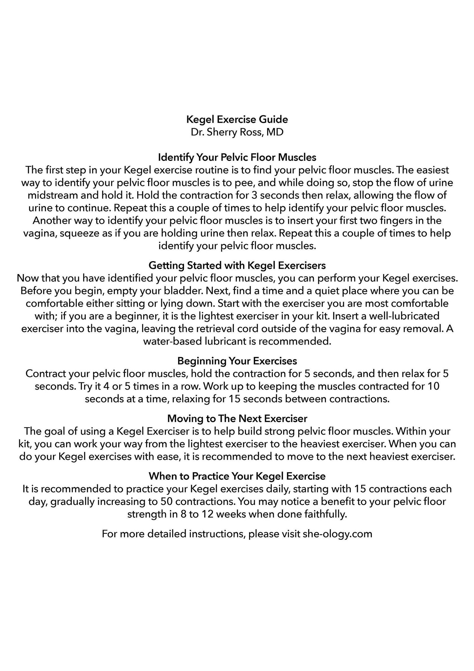 The She-Ology Interchangeable Weighted Kegel Set is ergonomically designed to tighten and tone pelvic muscles. Created to give you a fully customizable workout regimen, the set of 6 variable weighted kegel balls can be mixed and matches with the single or double ball holder to give your muscles exactly what they need. From smallest to largest, the weight set include 20 g, 25 g, 30 g, 35 g, 40 g, and 45 gThe premium silicone weights assist to train and tone kegel muscles, increasing sexual satisfaction, sensual stimulation, and pelvic floor strength with every use. The graduated set has been created to tone and tighten kegel muscles over time. The hypoallergenic premium silicone set is body safe, unscented and phthalate free to keep you most sensitive spots, happy and healthy.