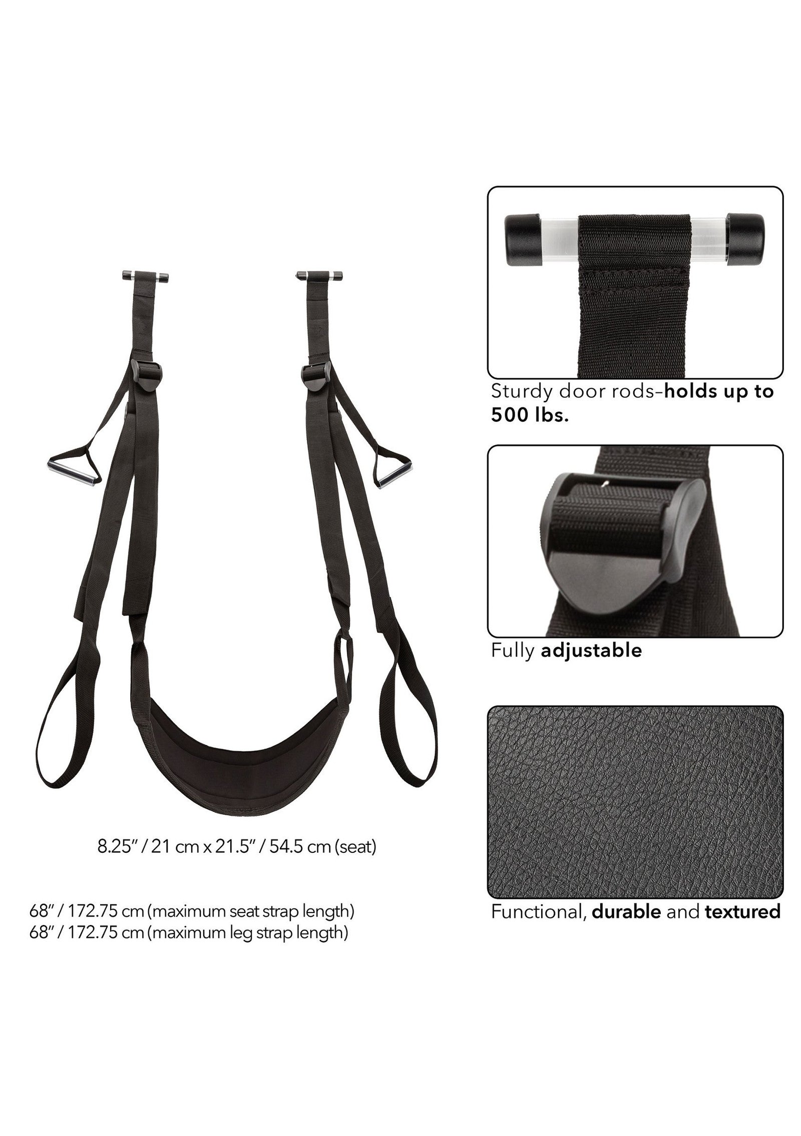 Transform your intimate moments with the Nocturnal Collection Sex Swing, a premium accessory designed to elevate your pleasure. Featuring sturdy door rods and a comfortable, padded seat, this sex swing offers unmatched support and control, allowing you to explore new positions with ease and comfort. Designed for use over a door, the Nocturnal Collection Sex Swing is built to hold up to 500 lbs., ensuring stability during your most passionate encounters. Adjustable foot straps and handles provide additional support, allowing you to customize your experience to fit your desires.